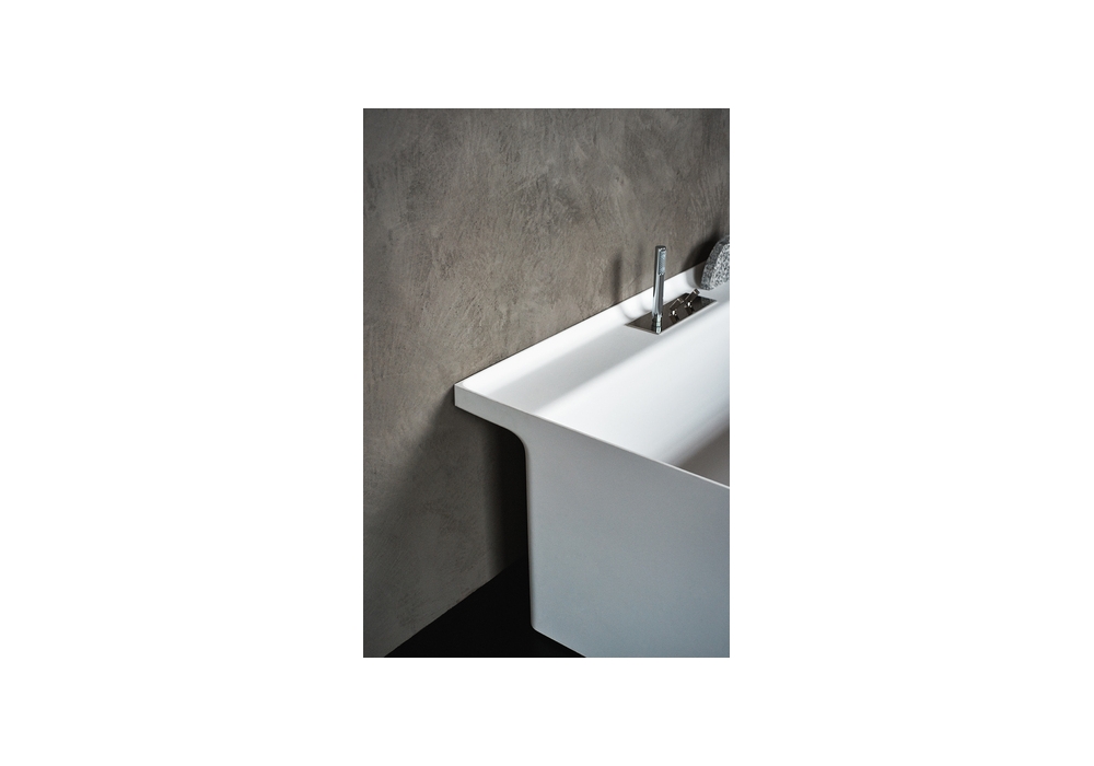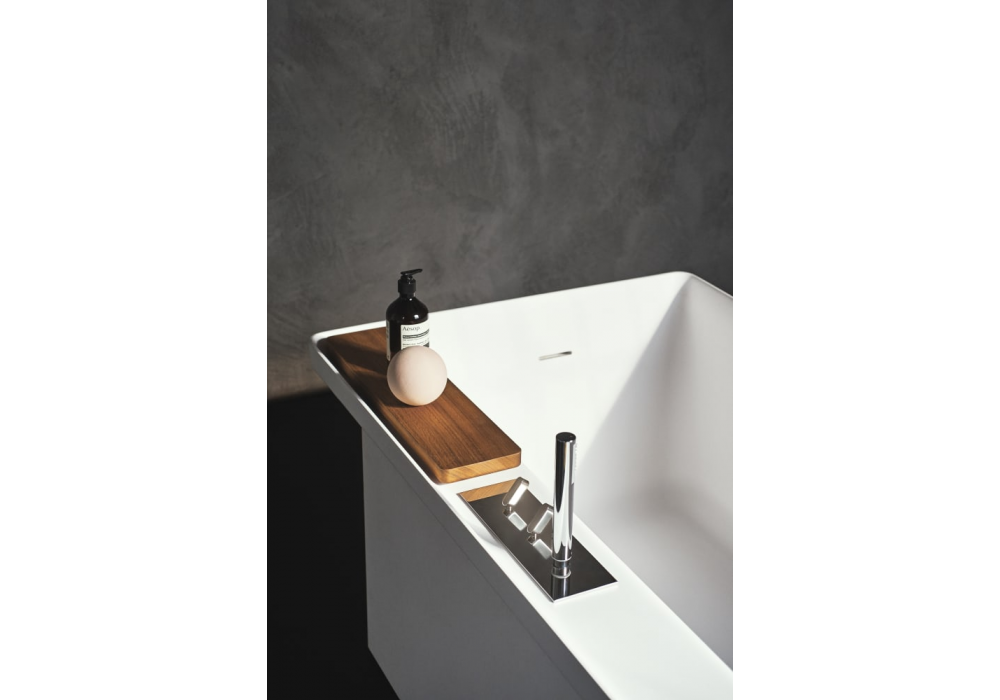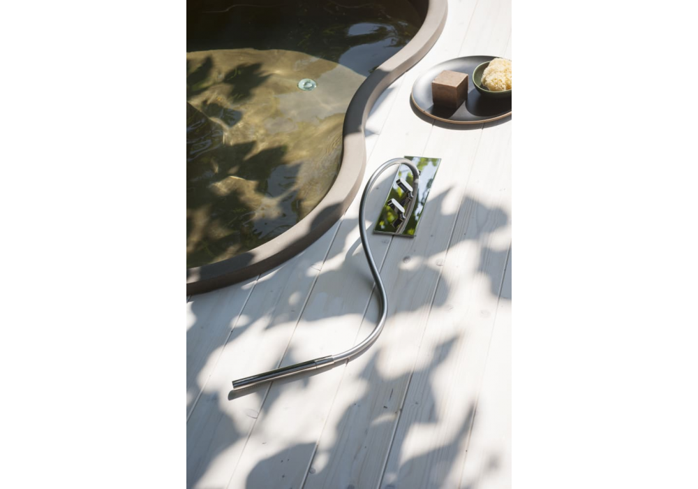 Square von Benedini Associati für Agape entworfen, ist ein Badewannenrandhahn aus poliertem oder satiniertem Edelstahl AISI316L. Er besteht aus einem progressiven Einhebelmischer und einer integrierten Dusche (flexibler Schlauch und Dusche inklusive).