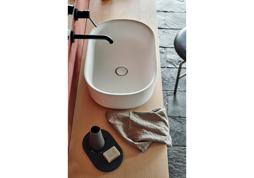 Fez 2 von Benedini Associati für Agape entworfen, ist ein wandmontierter Waschtischhahn aus Messing in verschiedenen Ausführungen. Verfügbar mit 15 oder 20 cm Öffnung.