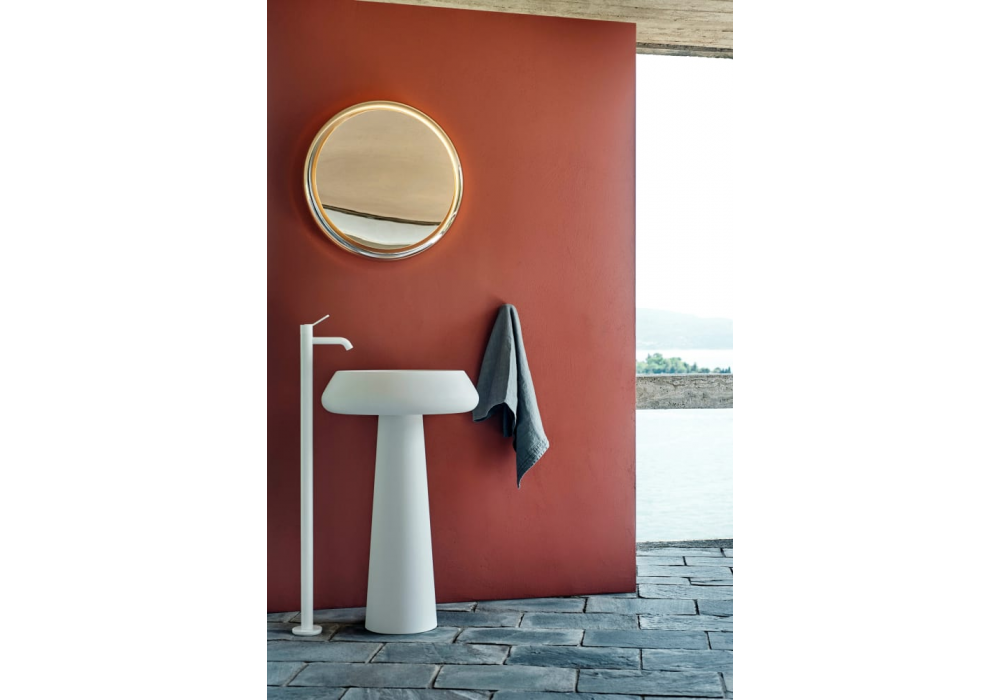 Fez 2 von Benedini Associati für Agape entworfen, ist eine bodenstehende Einloch-Spültischbatterie aus Messing mit polierter Chromoberfläche oder in Weiß oder Schwarz lackiert.