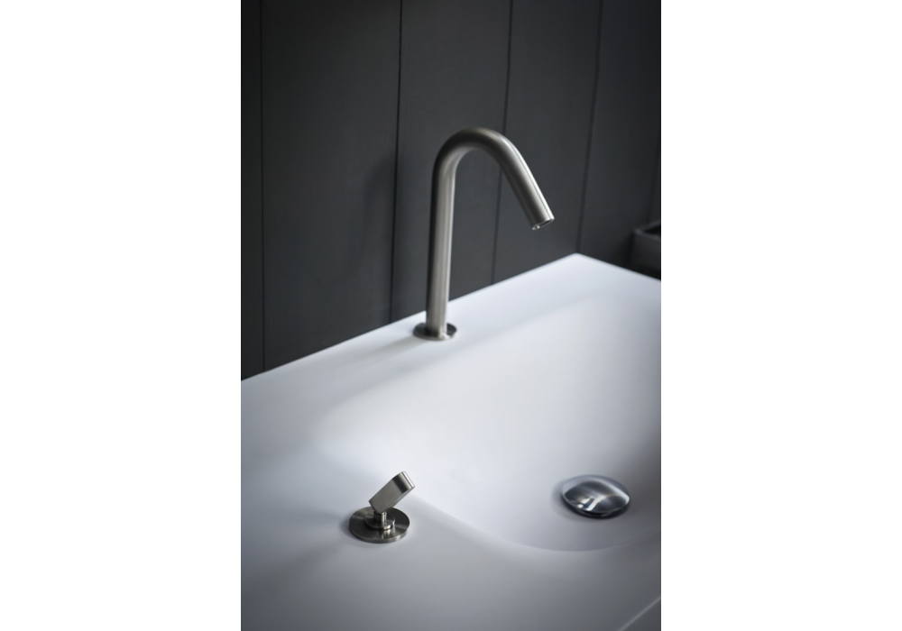 Square von Benedini Associati für Agape entworfen, ist ein Einloch-Waschtischmischer aus poliertem oder mattiertem Edelstahl AISI316L. Er besteht aus einem Auslauf und einem Joystick-Mischer. Flexible Stromleitungen inklusive.