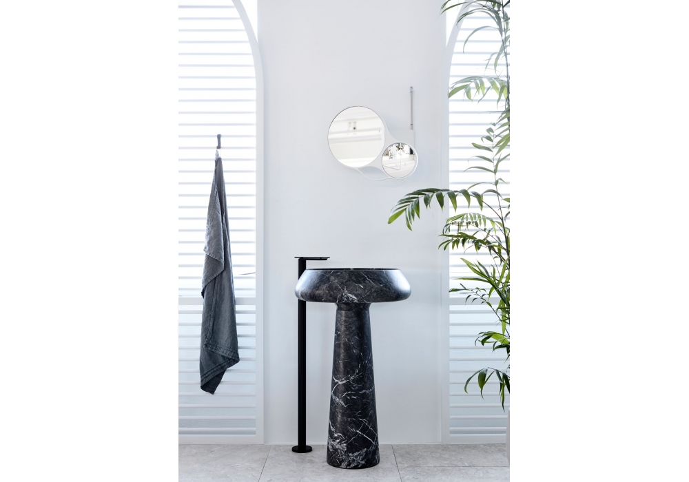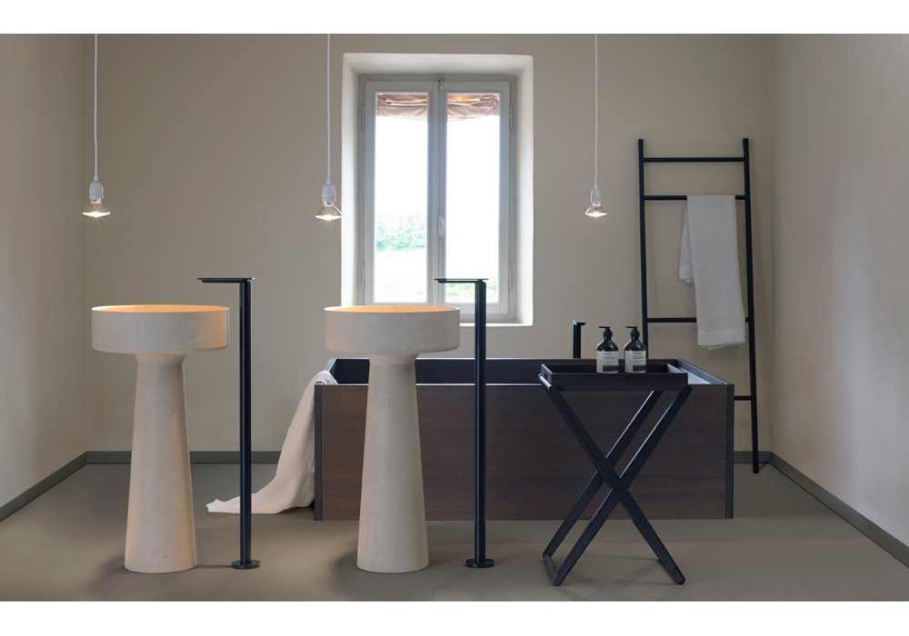 Sen von Gwenael Nicolas „Curiosity for Agape“ ist eine bodenmontierte Waschtisch-Mischbatterie aus gebürstetem, eloxiertem Aluminium mit schwarzem Finish und unabhängigen Bedienelementen.