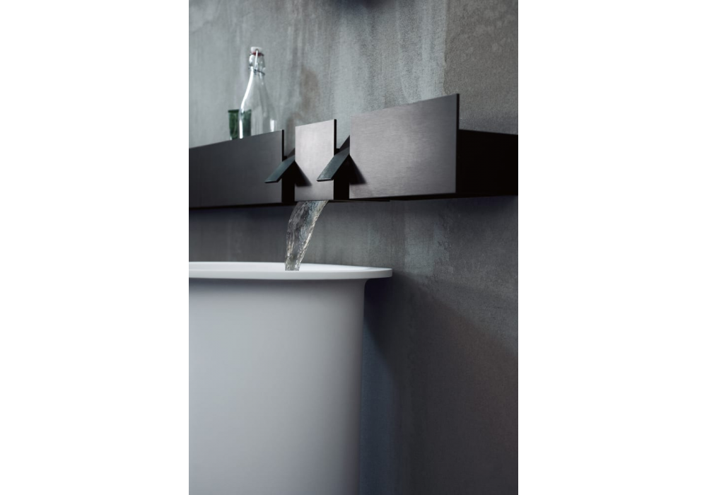 Sen von Gwenael Nicolas „Curiosity for Agape“ ist ein wandmontierter Wasserhahn aus gebürstetem, eloxiertem Aluminium mit schwarzem Finish für ein Waschbecken mit horizontalem Auslauf.
