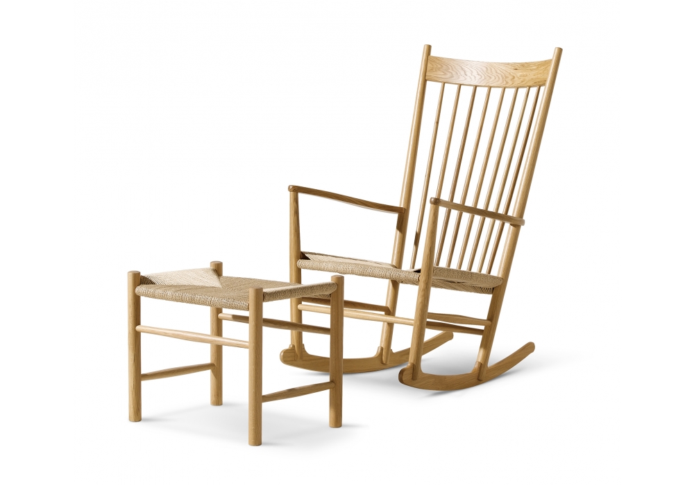 Wegner J16 von Hans J. Wegner für Fredericia entworfen, ist ein Fußstütze aus massivem Walnuss- oder Eichenholz. Sitz aus geflochtenem Papierseil in natürlicher oder schwarzer Ausführung.