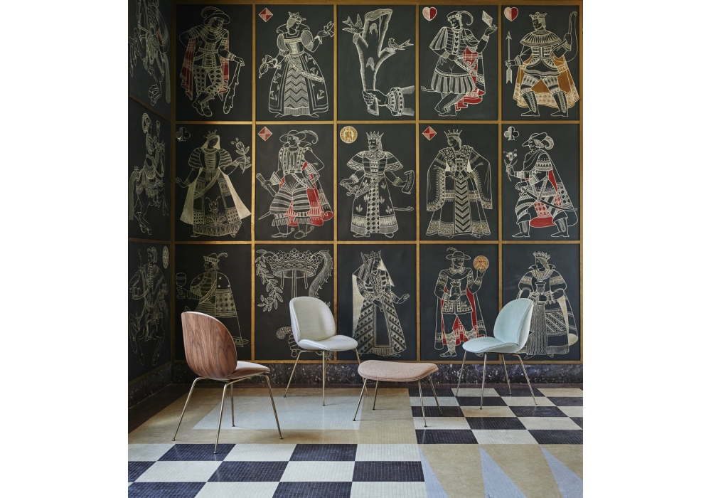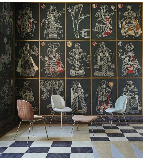 Beetle von GamFratesi für Gubi entworfen, ist eine Fußstütze mit Beinen aus pulverbeschichtetem Stahl in Schwarz oder Messing. Bezug in verschiedenen Stoffen oder Leder erhältlich.