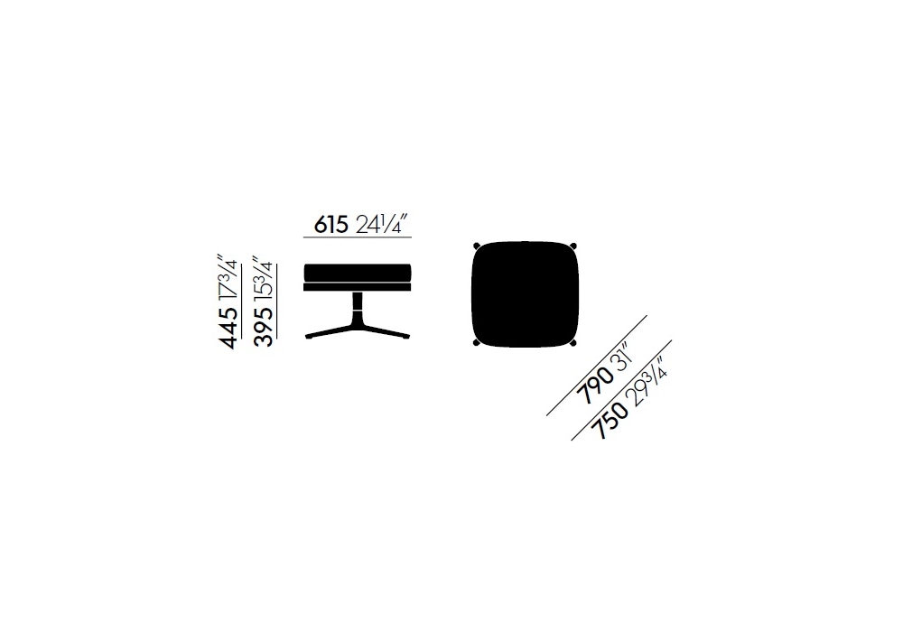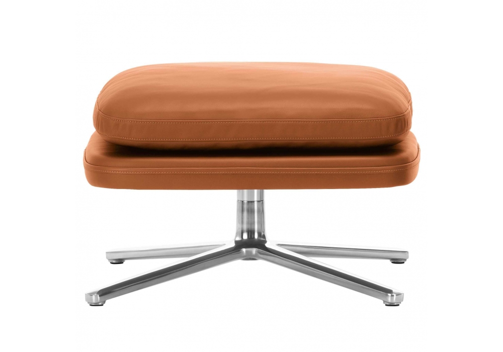 Grand Relax Ottoman, entworfen von Antonio Citterio für Vitra, ist eine Fußstütze mit drehbarer Basis und vier Speichen aus Aluminiumdruckguss, poliert oder pulverbeschichtet. Die Kontur des Sitzes und des Kissens sind mit Leder bezogen.