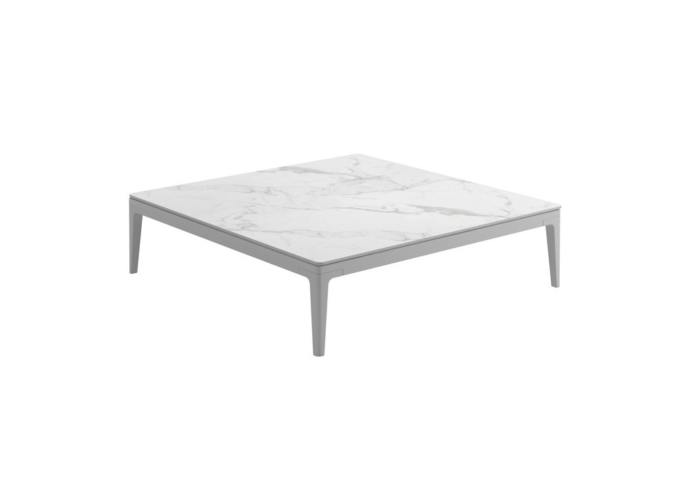 Grid Square, von Henrik Pedersen für Gloster entworfen, ist ein Outdoor-Couchtisch mit pulverbeschichtetem Aluminiumrahmen und Teak- oder Keramikplatte.