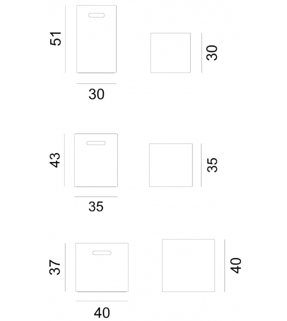 | Abmessungen | L 30 x W 30 x H 51 cm; L 35 x W 35 x H 43 cm; L 40 x W 40 x H 37 cm |