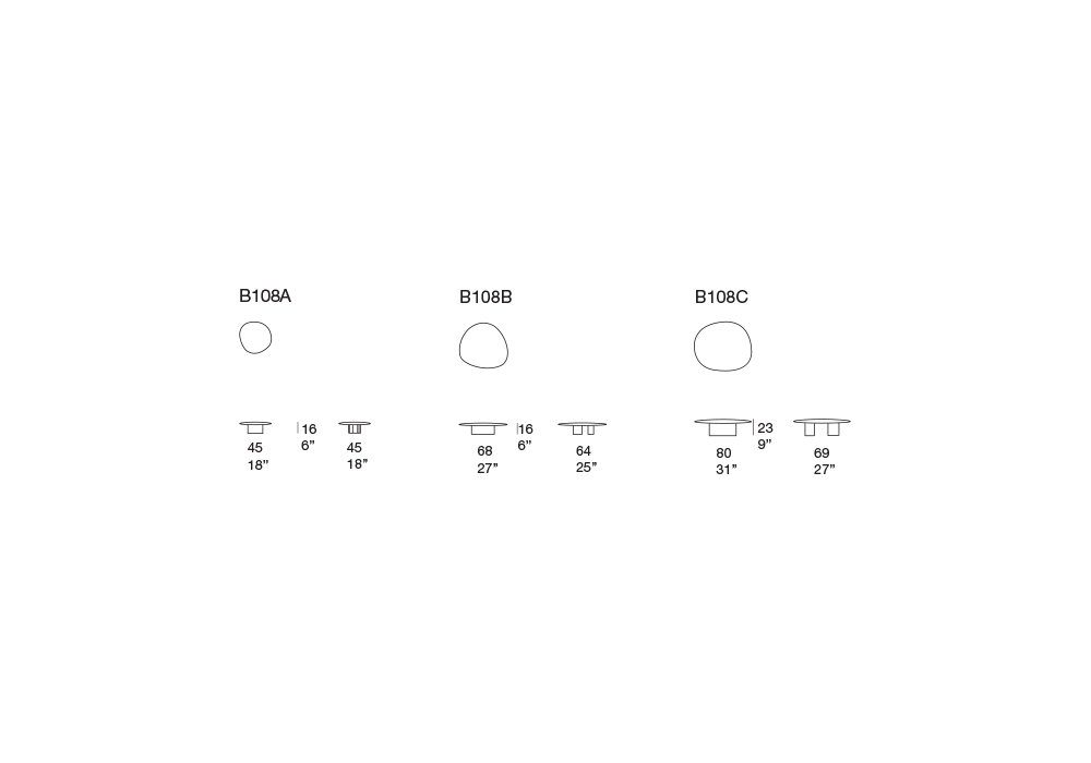 | Abmessungen | 45 x 45 x H 16 cm (B108A); 68 x 64 x H 16 cm (B108B); 80 x 69 x H 23 cm (B108C). |