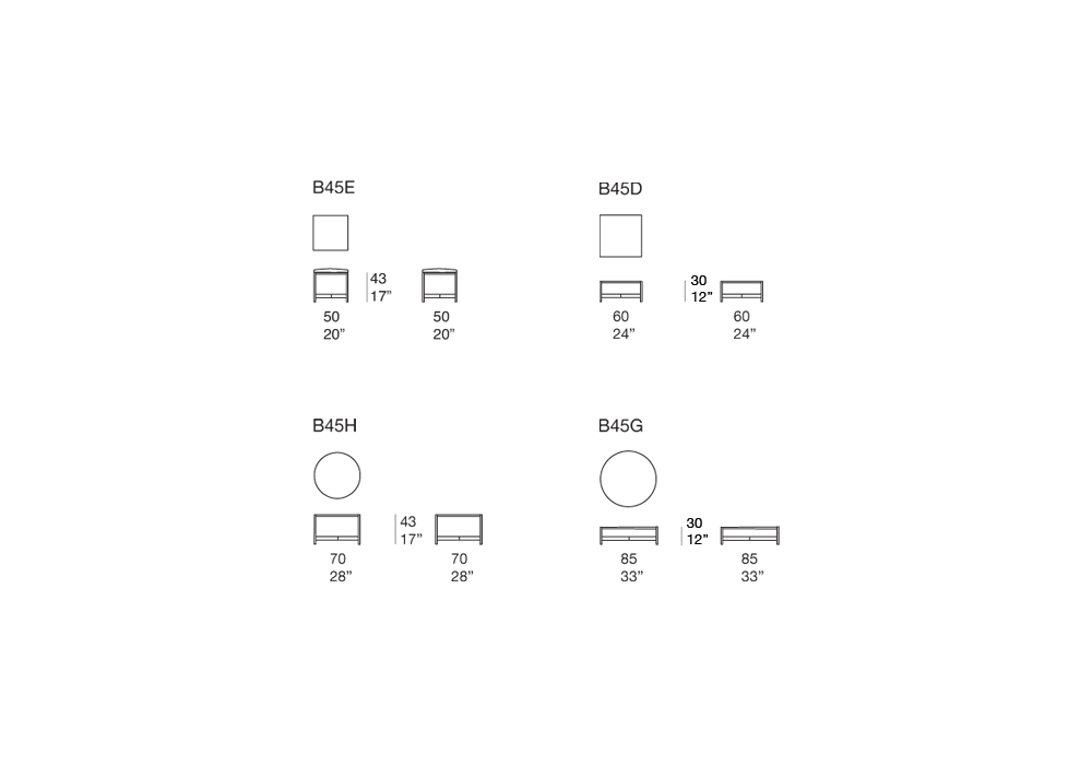 | Abmessungen | 60 x 60 x H 30 cm (B45D); 50 x 50 x H 43 cm (B45E); Ø 85 x H 30 cm (B45G); Ø 70 x H 43 cm (B45H). |