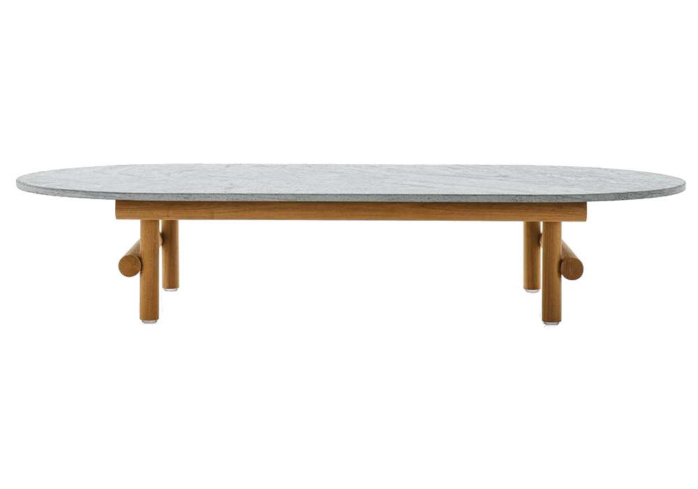 Ayana, entworfen von Naoto Fukasawa für B&B Italia Outdoor, ist ein couchtisch im Freien aus Teakholz und eine Platte aus Serpentino-Stein.