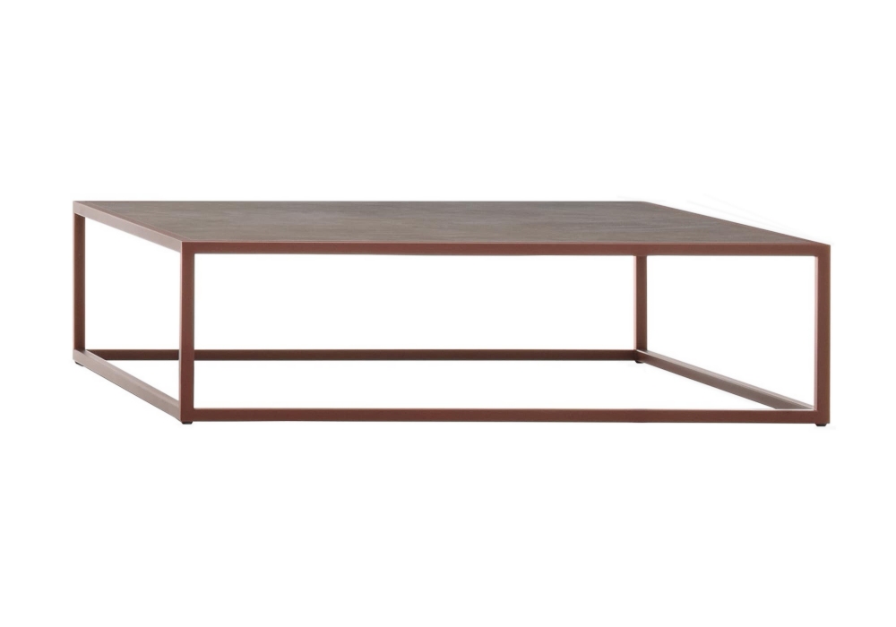 Arpa, von Ramón Esteve für MDF Italia entworfen, ist ein Couchtisch mit tragender Struktur aus Edelstahl, Querschnitt 2 x 2 cm, lackiert mit Epoxidpulvern mit spezieller Behandlung für den Außenbereich. Platte aus feinem laminiertem Feinsteinzeug in verschiedenen Farben.