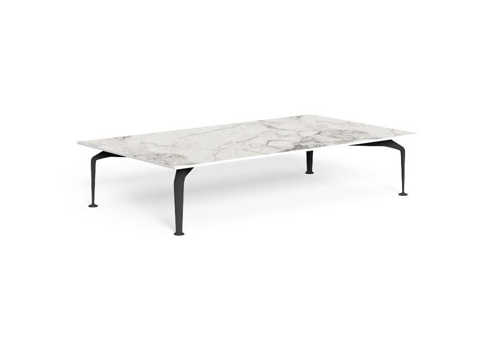 Cruise Alu, entworfen von Ludovica und Roberto Palomba für Talenti, ist ein Couchtisch mit Aluminiumstruktur in drei Ausführungen, Weiß, Graphit oder Aquagrün und Steinzeug in 12 mm Calacatta-Ausführung.