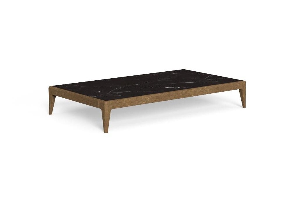 Cruise Teak von Ludovica und Roberto Palomba für Talenti entworfen, ist ein Couchtisch mit Holzstruktur und Steinzeugplatte, erhältlich in verschiedenen Ausführungen und Größen.