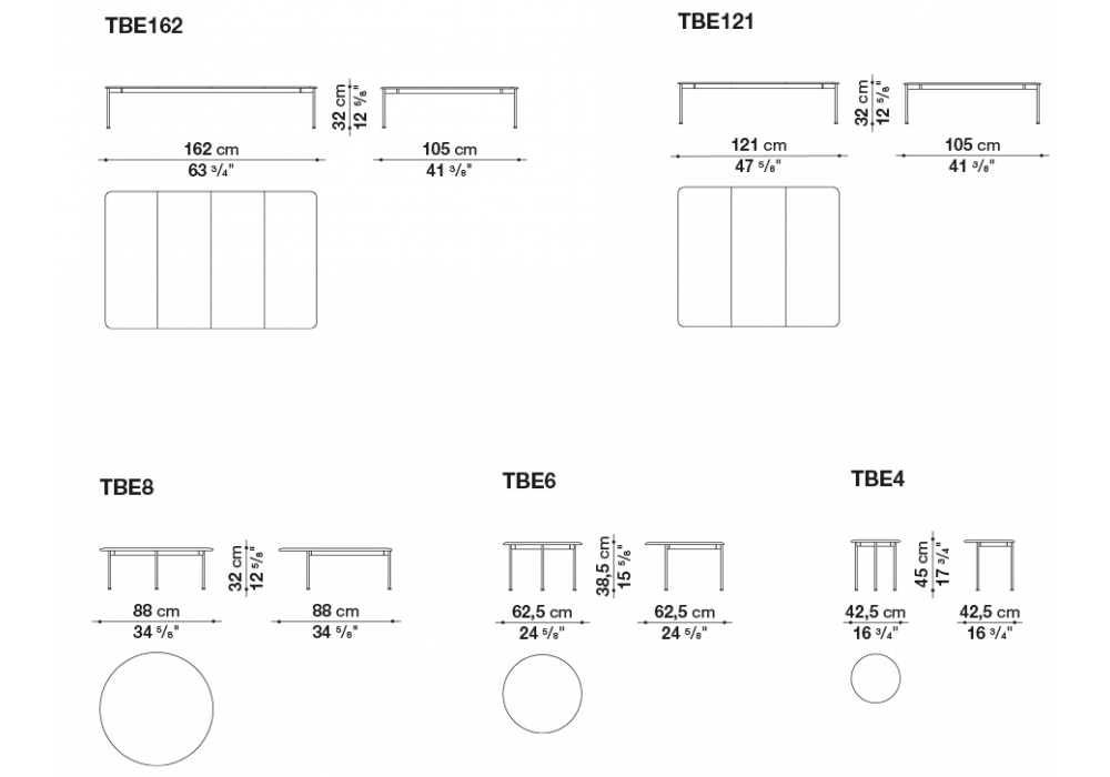 | Abmessungen | Ø 42,5 x H 45 cm; Ø 62,5 cm x H 38.5 cm; Ø 88 x H 32 cm; 121 x 105 x H 32 cm; 162 x 105 x H 32 cm. |