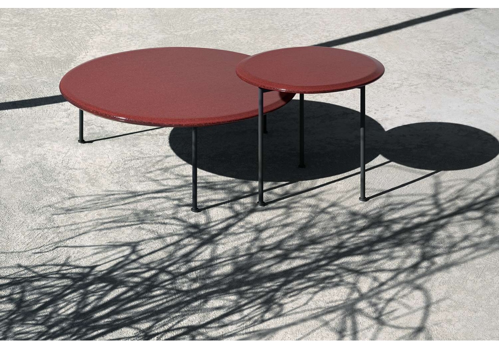 Borea von Piero Lissoni für B&B Italia Outdoor entworfen, ist ein Couchtisch mit einer Rohrstruktur aus Edelstahl. Platte aus emailliertem Lavastein. Verfügbar in mehreren Größen.