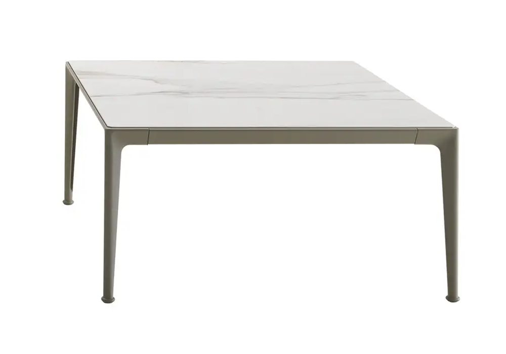 Mirto von Antonio Citterio für B&B Italia Outdoor entworfen ist ein niedriger Tisch, der in verschiedenen Größen erhältlich ist. Hergestellt mit einer lackierten Aluminiumstruktur in verschiedenen Ausführungen und einer Platte aus weißem Calacatta-Feinsteinzeug.