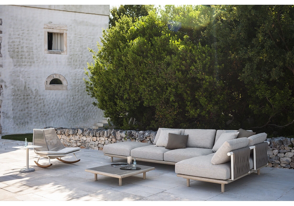 Eden von Rodolfo Dordoni für Roda entworfen, ist ein Couchtisch für den Außenbereich bestehend aus wetterbeständigem Teakholzgestell und Tischplatte aus Teakholz oder Stein.