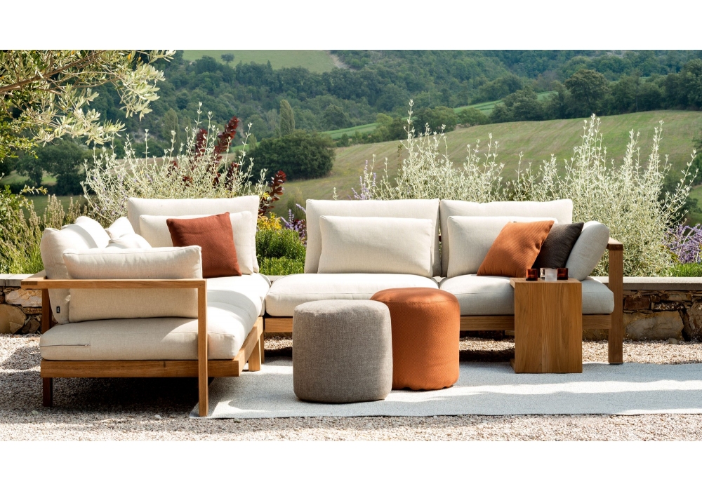 Pure signiert und hergestellt von Tribù ist ein C-förmiger Couchtisch, der vollständig aus Teakholz besteht. Es lässt sich perfekt mit den Sitzen der Kollektion kombinieren und ist auch einzeln sehr funktional.