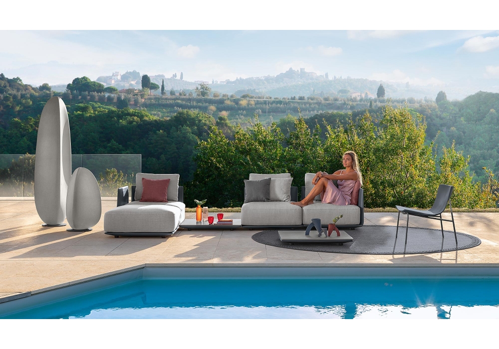 Malè von Ludovica + Roberto Palomba für Talenti entworfen, ist ein quadratischer Couchtisch mit Sockel aus Polyethylen und Platte aus Steingut.
