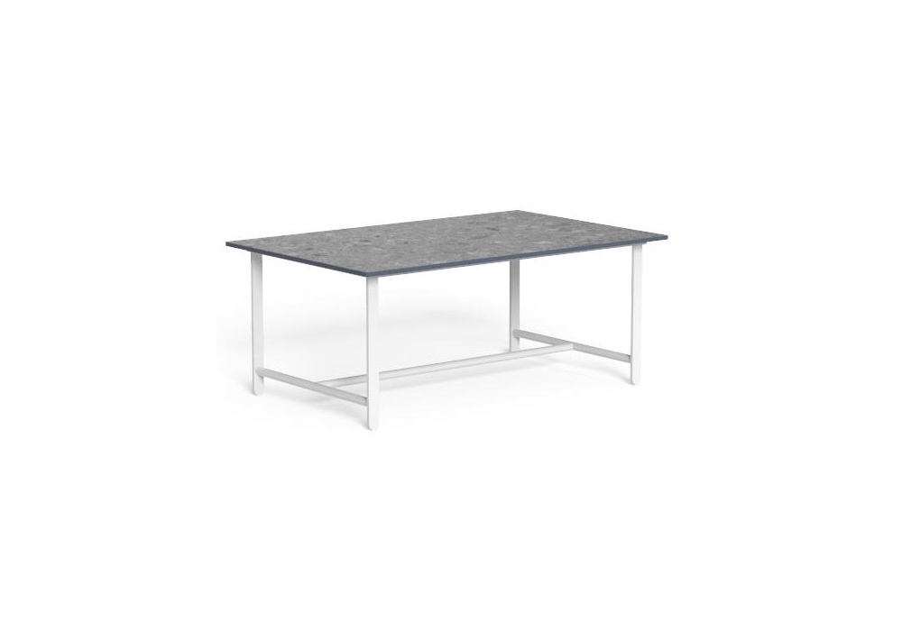 Riviera, von Jean Philippe Nuel für Talenti entworfen, ist eine Couchtischkollektion für den Außenbereich, die aus einer Aluminiumbasis und einer Steinzeugplatte besteht.