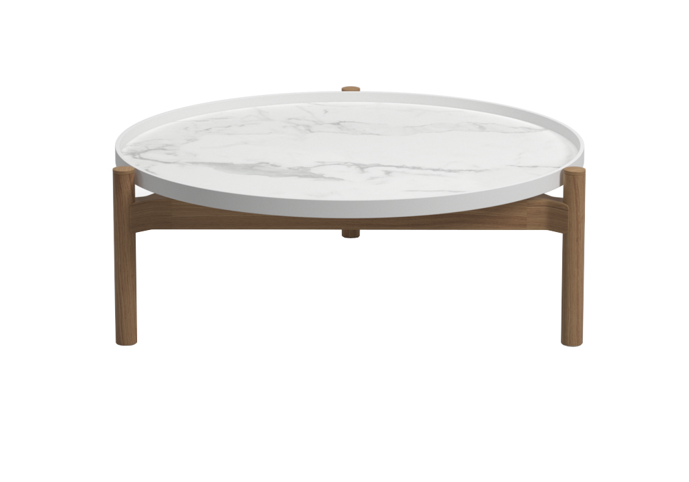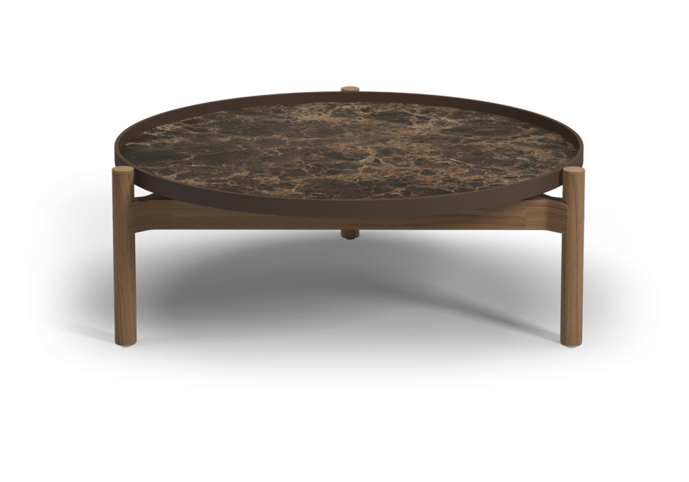 Sepal, von Mark Gabbertas für Gloster entworfen, ist ein Beistelltisch für den Außenbereich, der aus einem Gestell aus natürlichem Teakholz und einer Keramiktischplatte mit pulverbeschichtetem Aluminiumrand besteht.