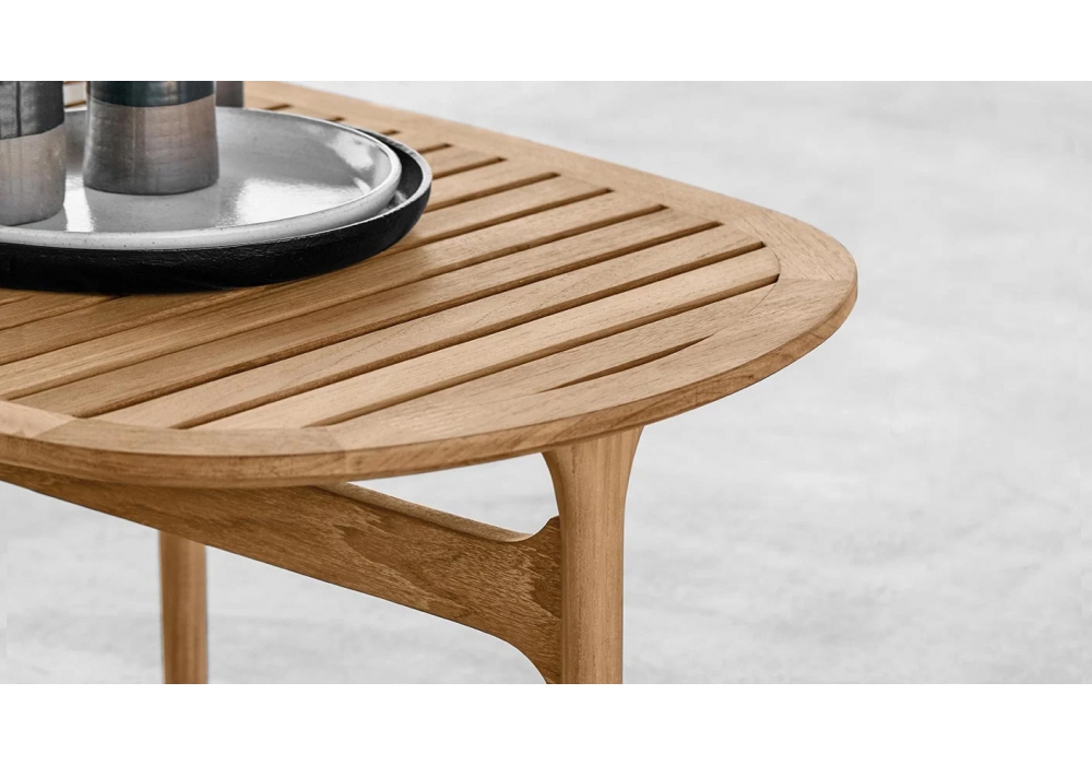 Bay, von Henrik Pedersen für Gloster entworfen, ist ein Outdoor-Couchtisch, der aus einem Teakholzrahmen und einer gelatteten Teakholz-Tischplatte besteht.
