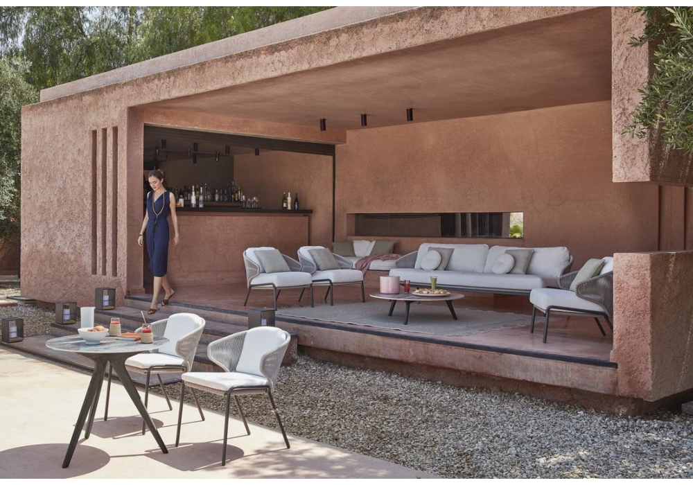 Torsa, von Stephane De Winter für Manutti entworfen, ist ein Outdoor-Couchtisch mit Teakholzbasis und Keramikplatte. Es ist in verschiedenen Ausführungen und Größen erhältlich.