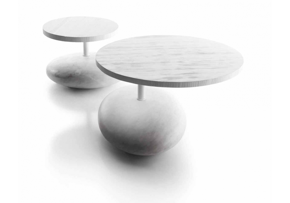Pavè Drink von Enzo Berti für Kreoo entworfen, ist ein Couchtisch mit einer "Kiesel"-förmigen Basis aus Marmor und einer Platte aus Lärchenholz. Verfügbar in mehreren Ausführungen und Abmessungen.