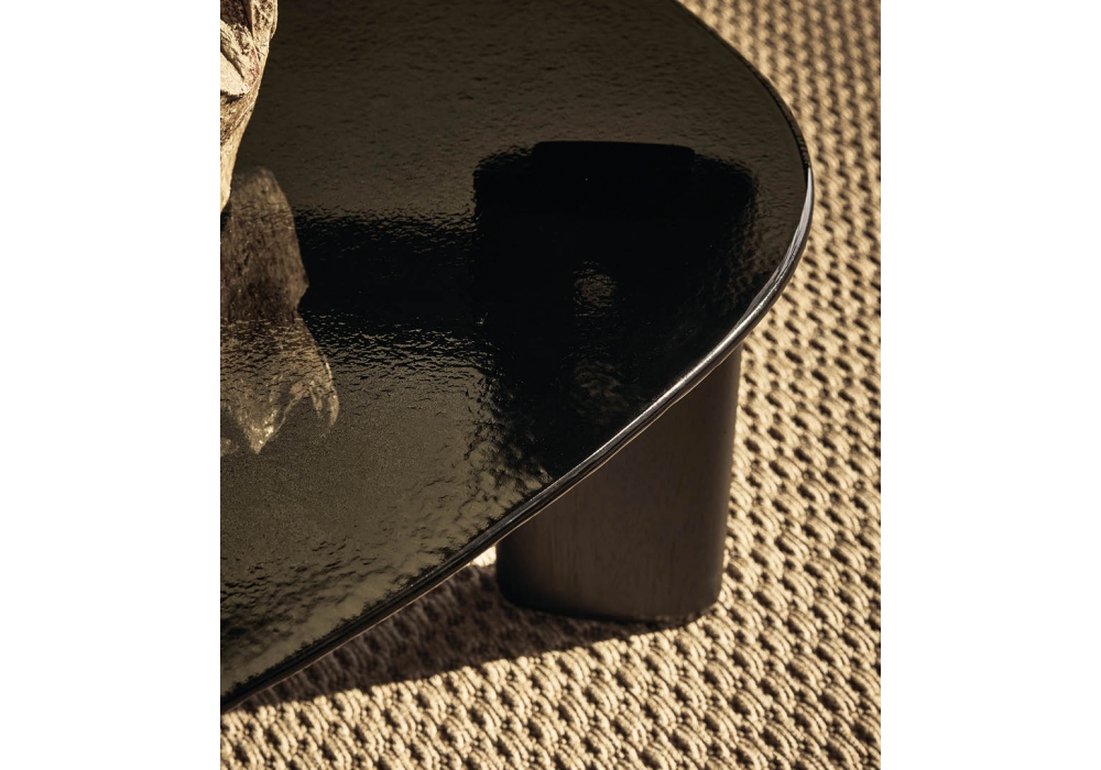 Ketch von Jean Marie Massaud für Poliform entworfen, ist ein Couchtisch mit Beinen aus massivem Iroko natur oder schwarz gebeiztem Iroko mit einer Struktur aus mattbraun lackiertem Edelstahl. Tischplatte aus geschmolzenem Glas fumé oder bronze oder aus massivem Iroko natur oder schwarz gebeiztem Iroko.