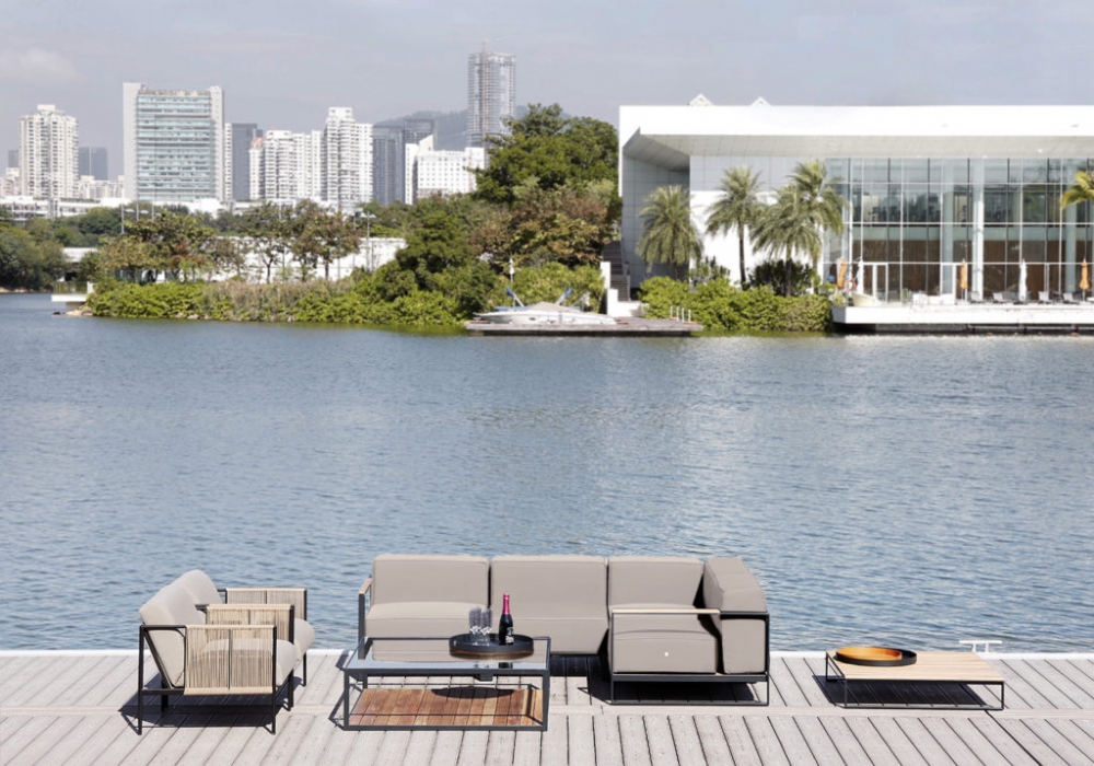 Garden Moore von Broberg & Ridderstråle für Röshults entworfen, ist ein Couchtisch mit einer Struktur aus anthrazitfarbenem Edelstahl und Teakholz. Verfügbar in mehreren Ausführungen.