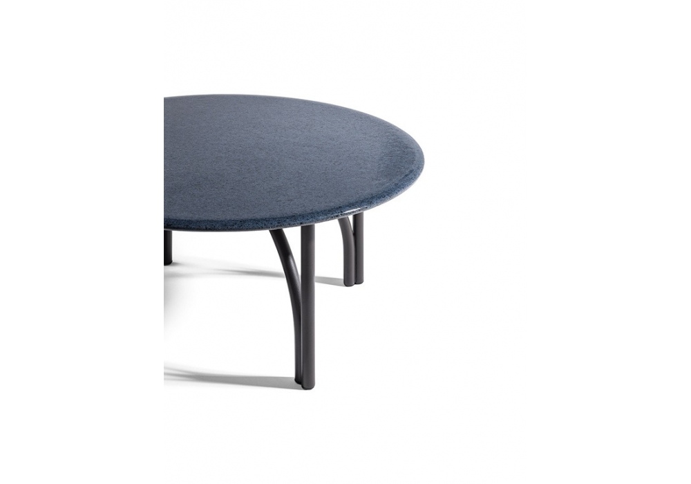 Mirabell von Gamfraesi für Poltrona Frau entworfen ist ein runder Outdoor-Couchtisch mit einer tragenden Struktur aus basaltfarben pulverbeschichtetem Aluminiumrohr. Die Tischplatte besteht aus lackiertem Aluminium oder emailliertem Lavastein. Mirabell ist in verschiedenen Ausführungen und Größen erhältlich.