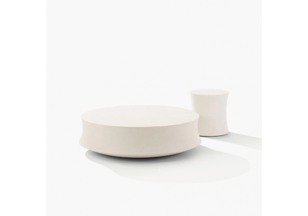 Soori Outdoor von Soo Chan für Poliform entworfen, ist ein Couchtisch aus Polyurethan mit Spachtelsteinüberzug und einem Durchmesser von 40 cm. Die Versionen mit einem Durchmesser von 80 bis 120 cm haben eine mit Spachtelstein überzogene Harzstruktur.