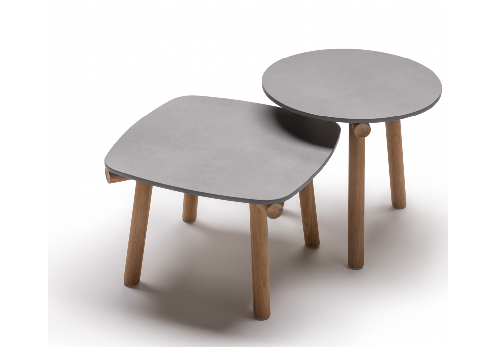 Kasumi von Mist - o für Living Divani entworfen, ist ein Beistelltisch für den Außenbereich mit Untergestell aus natürlichem Teakholz und Platte aus Feinsteinzeug.