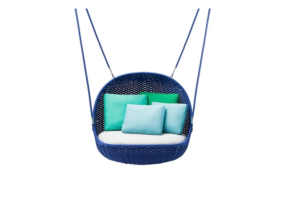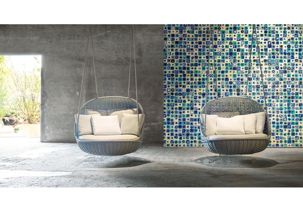 Orbitry von Victor Carrasco für Paola Lenti entworfen, ist ein hängender Sessel mit einem Sitzkissen, das mit verschiedenen Stoffen bezogen ist, und einer handgewebten Schale aus Seilgewebe. Die Aufhängeseile bestehen aus Edelstahlkabeln, die mit Seilgarn überzogen sind und die gleiche Oberfläche wie die Schalenpolsterung haben.