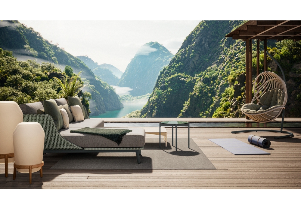 Kida von Stephen Burks für Dedon entworfen, ist ein Hängender Sessel mit pulverbeschichtetem Aluminiumgestell. Schale aus Faser und Polsterung aus Stoffkissen. Verfügbar in mehreren Ausführungen.