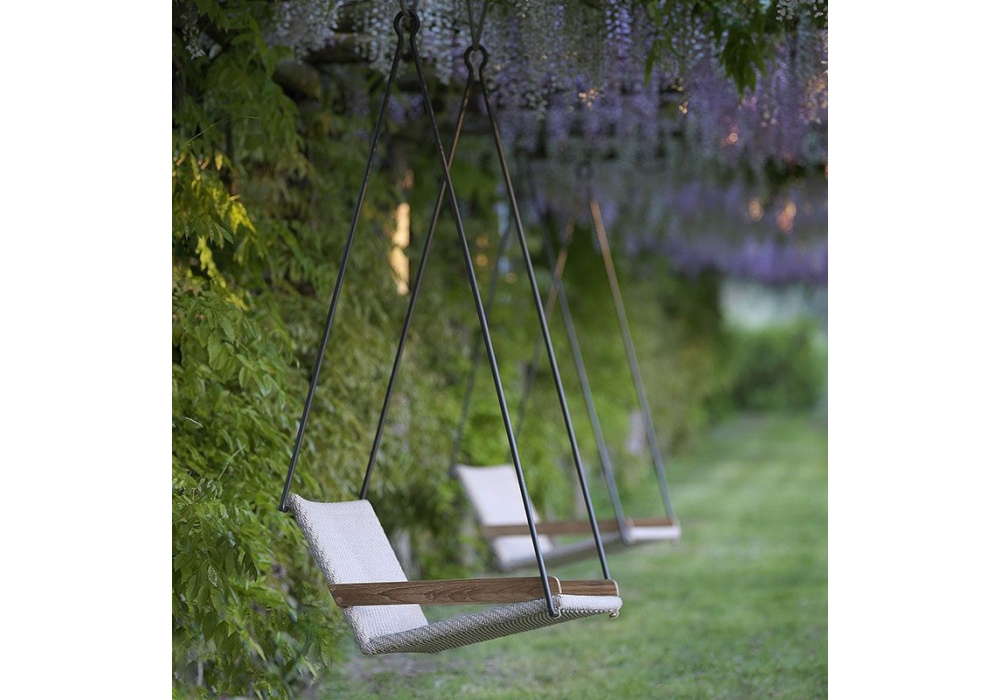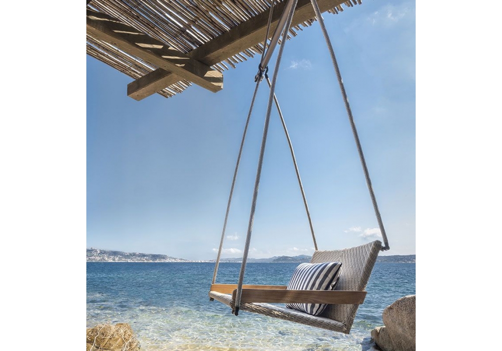 Allaperto Nautic von Matteo Thun, Antonio Rodriguez für Ethimo entworfen, ist ein hängender Sitz aus Teakholz und Metall mit Seilbespannung. Allaperto Nautic ist auch mit Kissen in verschiedenen Ausführungen erhältlich.