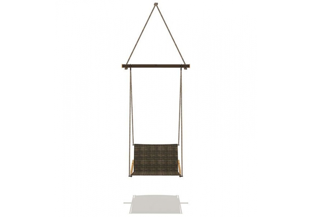 Allaperto Mountain, entworfen von Matteo Thun, Antonio Rodriguez für Ethimo, ist ein Hängesessel aus gebeiztem Teakholz und Metall mit Etwick-Faserbezug. Die Lobar-Kissen sind aus rotem Navajo-Acryl mit einem samtblauen Rand.