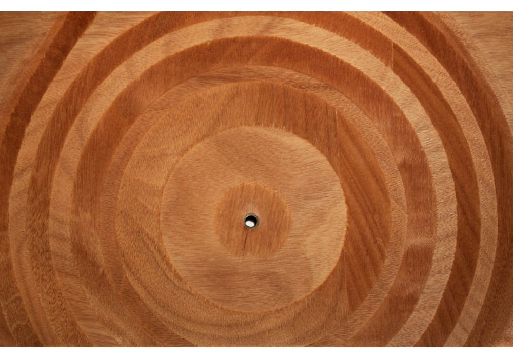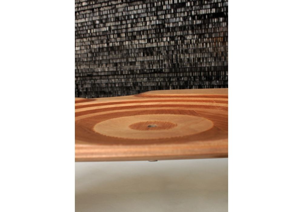 Ripples Outdoor von Toyo Ito für Casamania & Horm entworfen, ist eine Bank aus Okumé-Sperrholz, die aus mehreren überlappenden Schichten mit gekreuzter Maserung besteht. Loch für den Wasserabfluss an drei inneren konkaven Sitzen vorhanden. Sitz mit einer versteckten Metallstange verstärkt.
