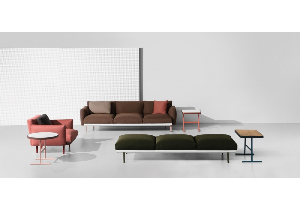 Boma von Rodolfo Dordoni für Kettal entworfen ist eine Bank mit Basis und Füßen aus lackiertem Aluminium. Die Kissen sind gepolstert und mit Stoff bezogen, der für den Außenbereich geeignet ist. Boma ist in verschiedenen Stoff- und Gestellausführungen und zwei Fußversionen erhältlich.