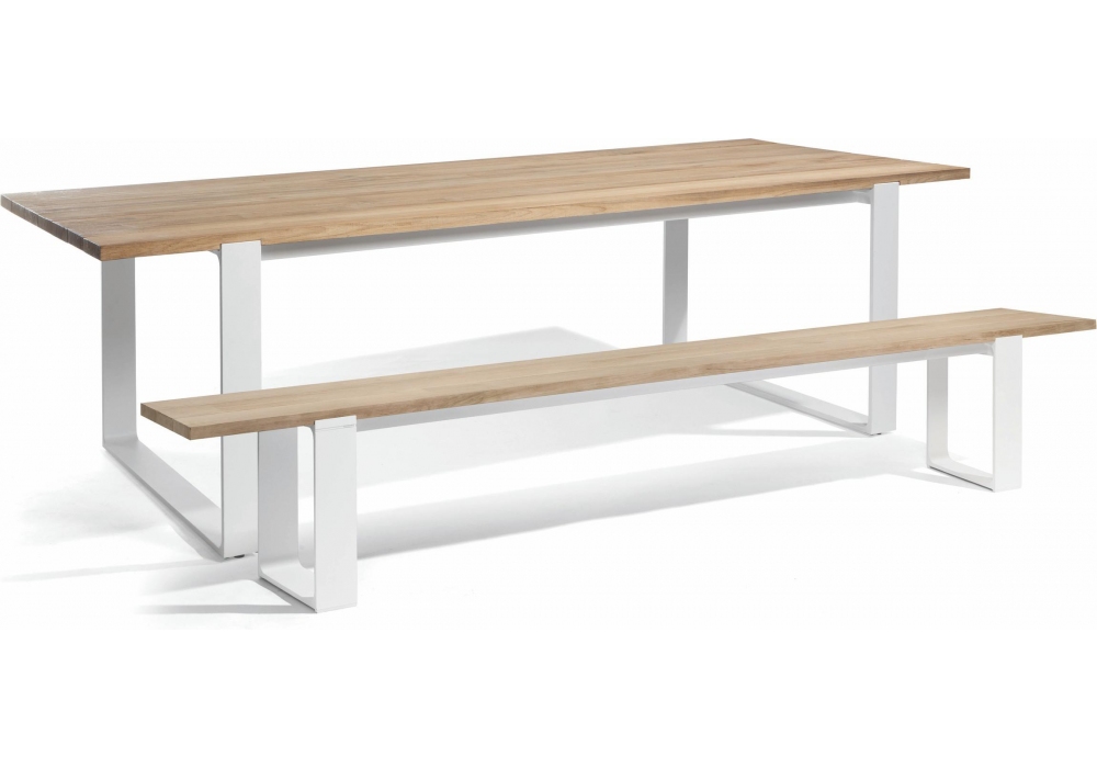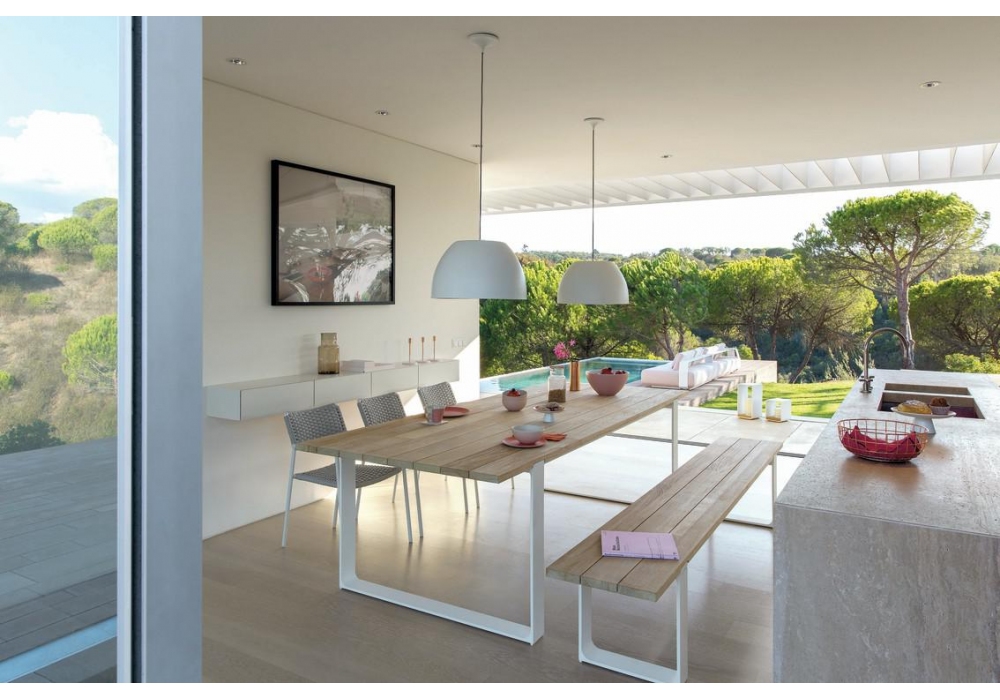 Prato von Manutti ist eine Bank mit Eisenstruktur in drei Ausführungen und Sitzfläche aus natürlichem oder dunklem Teakholz.