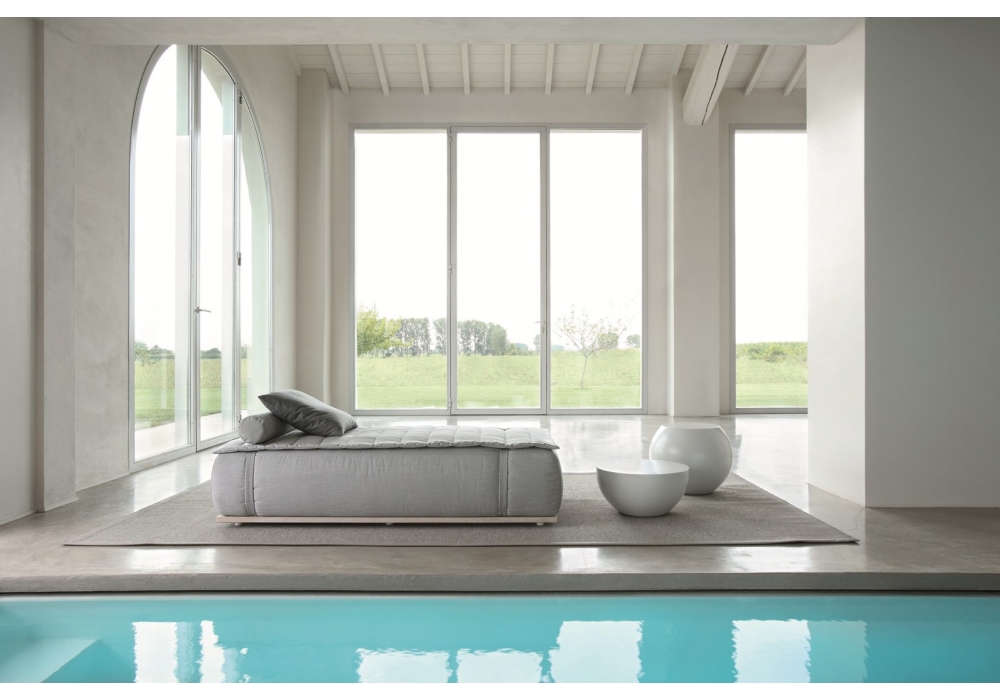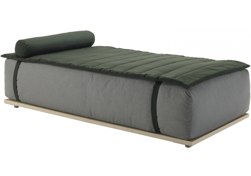 Claud Open Air von Andrea Parisio für Meridiani ist eine Sonnenliege für den Außenbereich. Holzgestell aus gebleichtem Irokoholz und Kissen aus PU-Schäumen und Polyesterfaser. Aufrollbarer Topper Für Liege mit Rolle aus Fiberball.