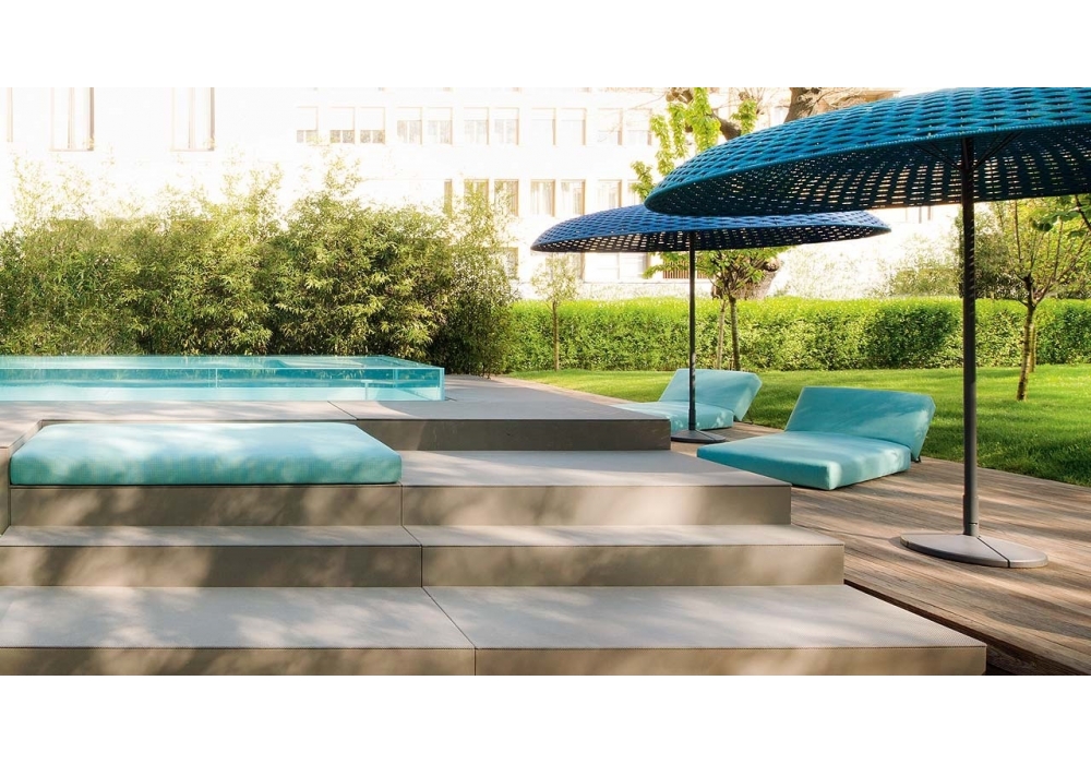 Swell von CRS Paola Lenti entworfen, ist eine Sonnenliege mit verstellbarer Rückenlehne in einer anderen Position als der Ruheposition. Struktur aus satiniertem Edelstahl und abnehmbarer Bezug in verschiedenen Stoffen und Farben.