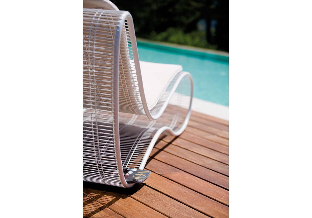 Breez ist eine Sonnenliege, die Karim Rashid für Talenti entworfen hat. Die Struktur besteht aus mit Nanokeramik behandeltem und pulverbeschichtetem Stahl. Die geschwungene Struktur schafft einen bequemen und stabilen Sitz, während die Netzstruktur einen besonders angenehmen Licht- und Schatteneffekt erzeugt.