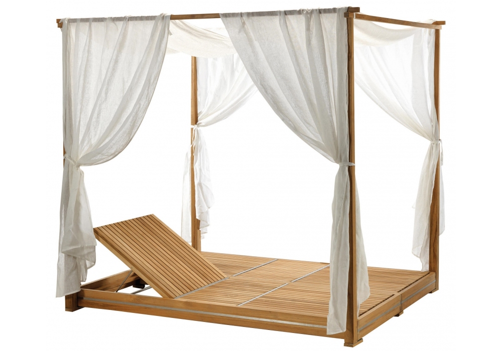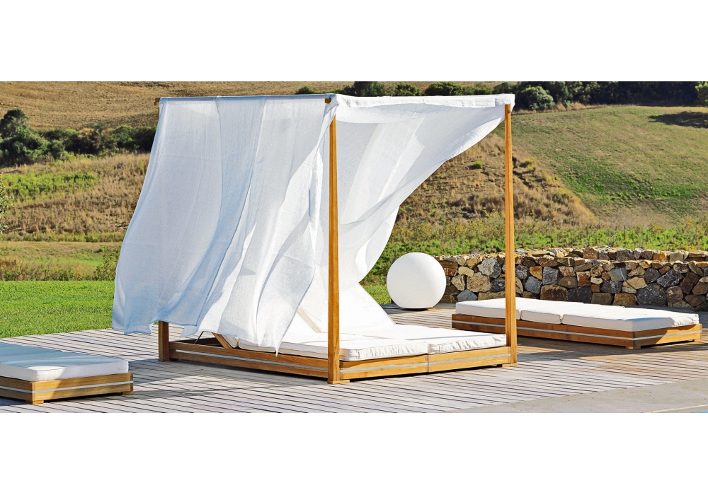 Essenza von Ethimo entworfen, ist ein Doppelbett mit Baldachin und Vorhängen aus Teakholz mit Stahleinlagen und verstellbarer Rückenlehne in vier Positionen. Zusätzliche Matratze aus Acrylgewebe, in verschiedenen Ausführungen erhältlich.
