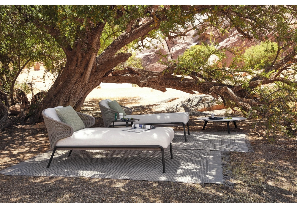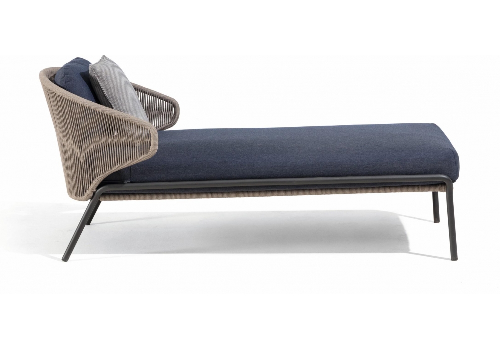 Radius von Stephane De Winter für Manutti entworfen, ist eine Chaise Longue aus Edelstahl und geflochtenem Seil. Polsterung der Kissen aus Stoff. Verfügbar in mehreren Ausführungen.