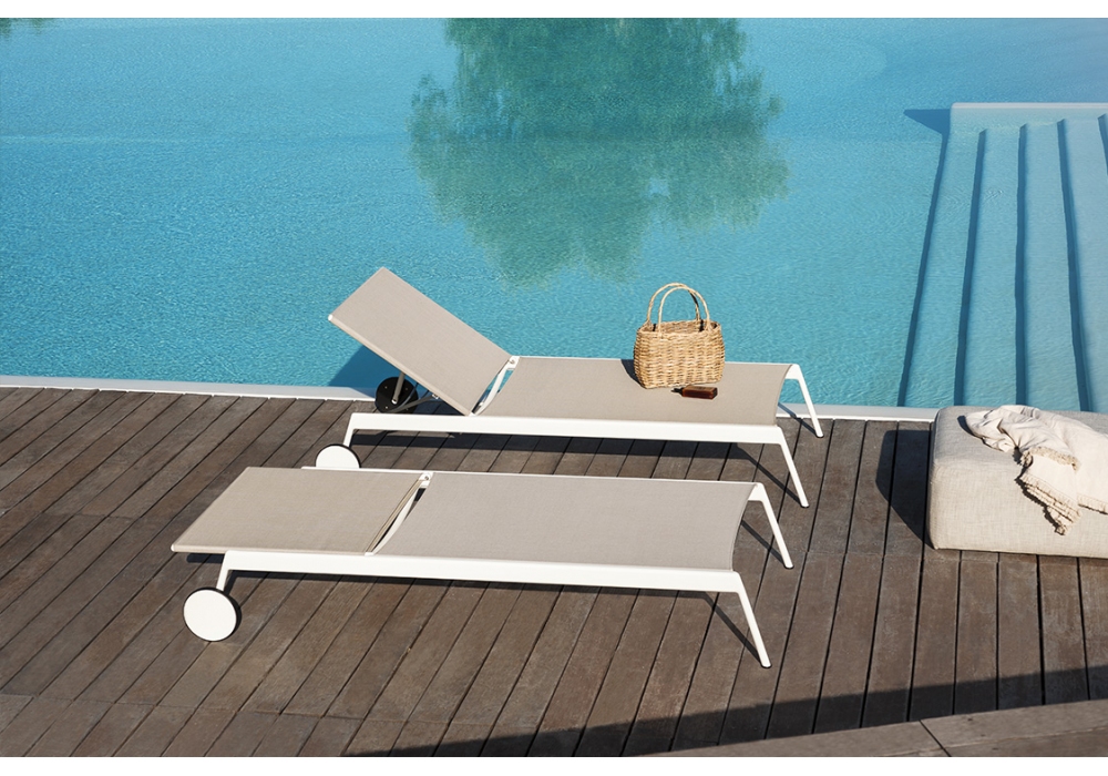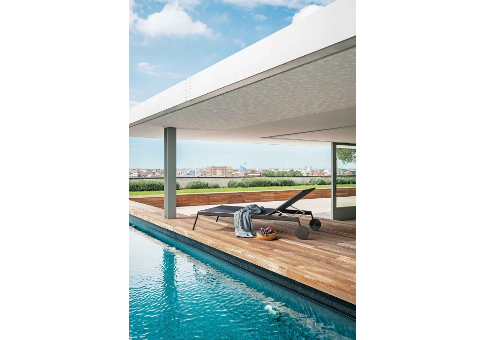 Piper 007 von Rodolfo Dordoni für Roda entworfen, ist eine Outdoor-Sonnenliege bestehend aus pulverbeschichteter Aluminiumstruktur, Batyline-Rückenlehne und Kissen mit Stoffbezug.