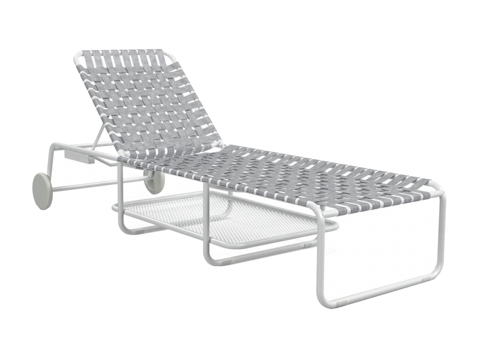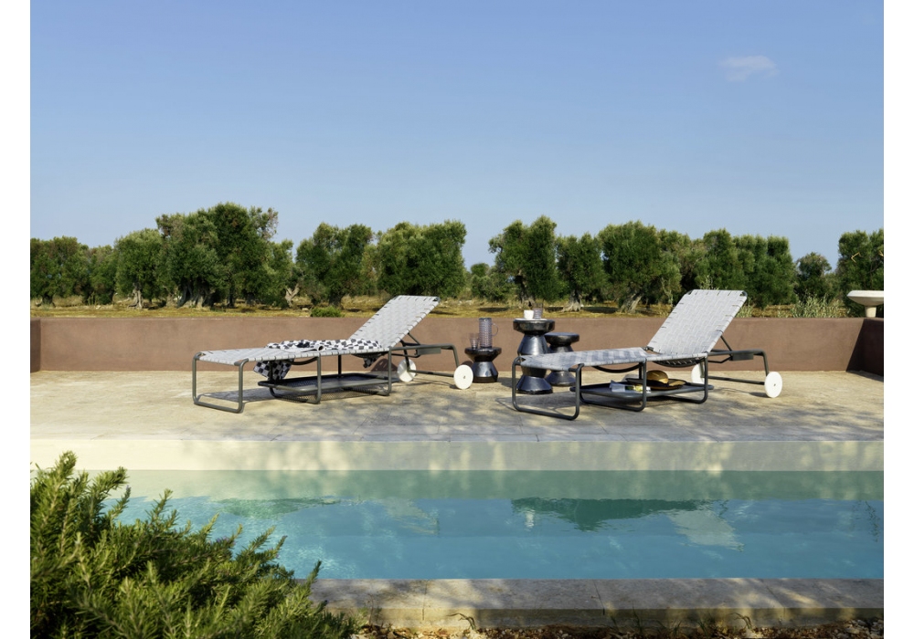 InOut 883 von Paola Navone für Gervasoni entworfen, ist eine Sonnenliege mit verstellbarer Rückenlehne und zwei Teflonrädern aus einer geprägten, lackierten Aluminiumrohrstruktur, die mit einem elastischen Band gewebt ist. Verfügbar in mehreren Ausführungen.