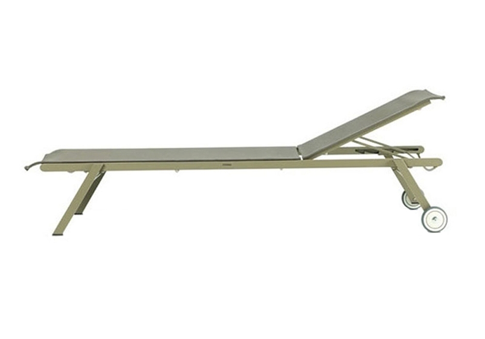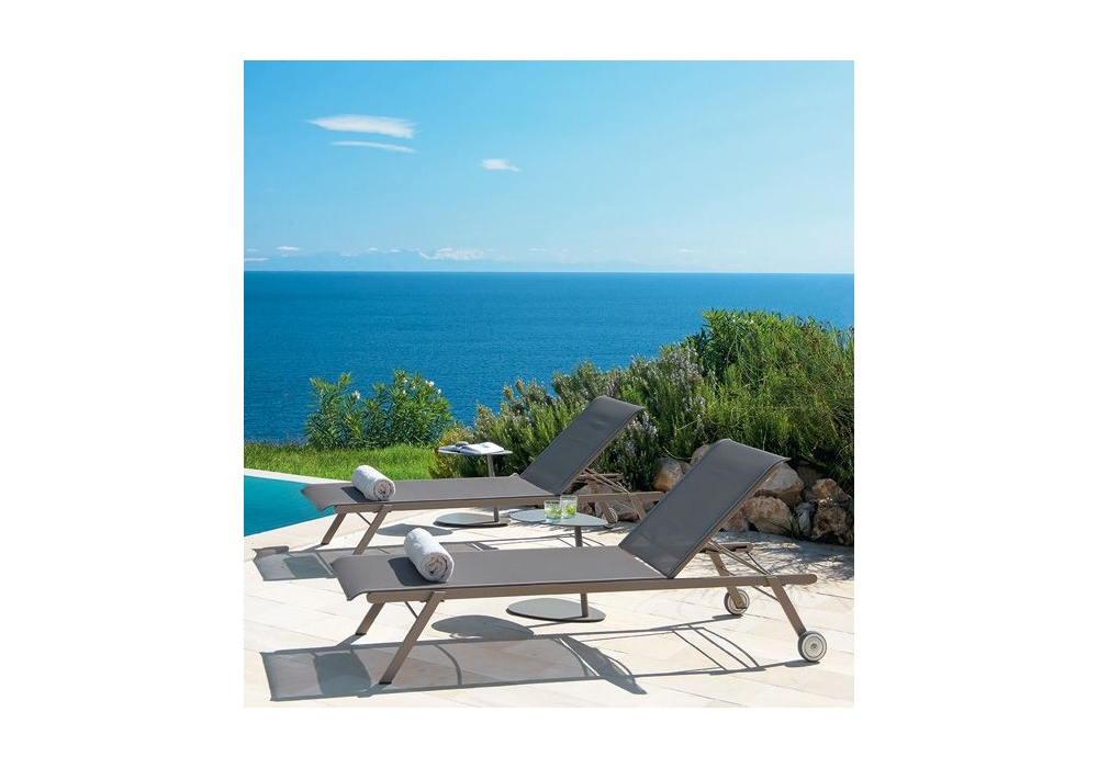 Elisir hergestellt und signiert von Ethimo ist ein Sonnenliege aus Metall mit Ethitex-Stoffbezug in Taubengrau und Elfenbein.