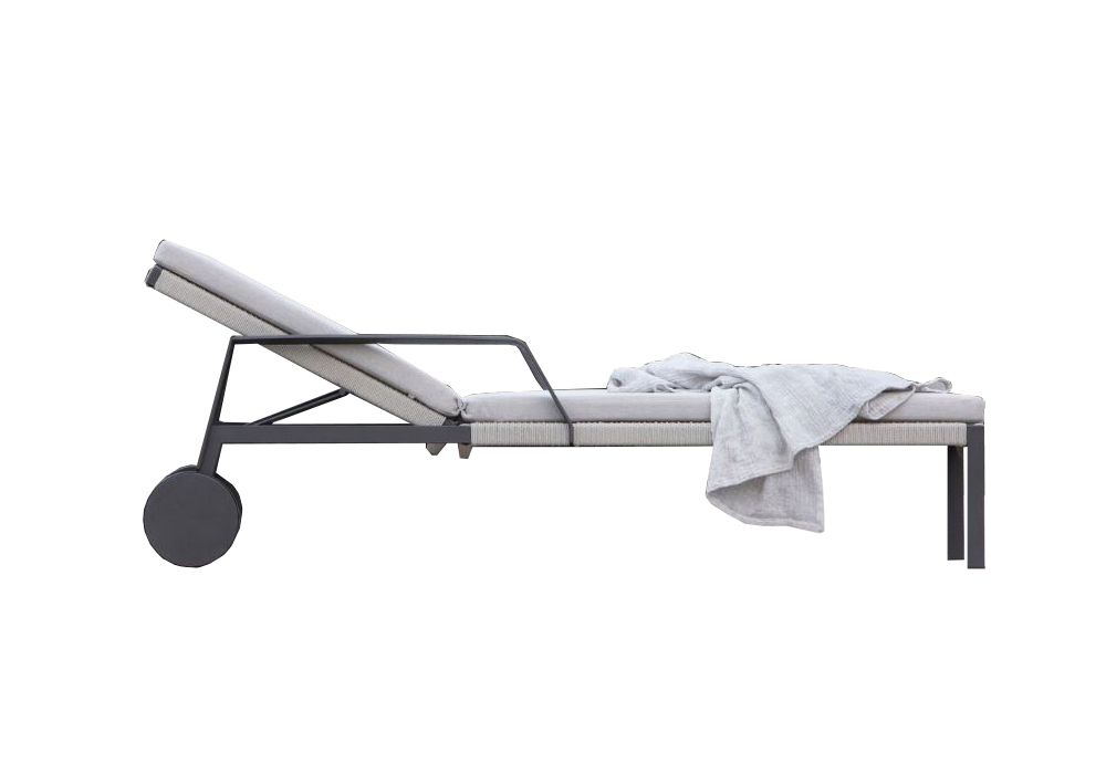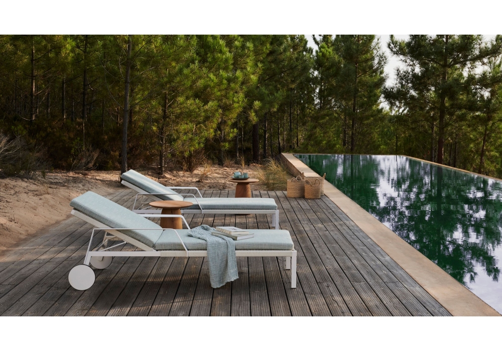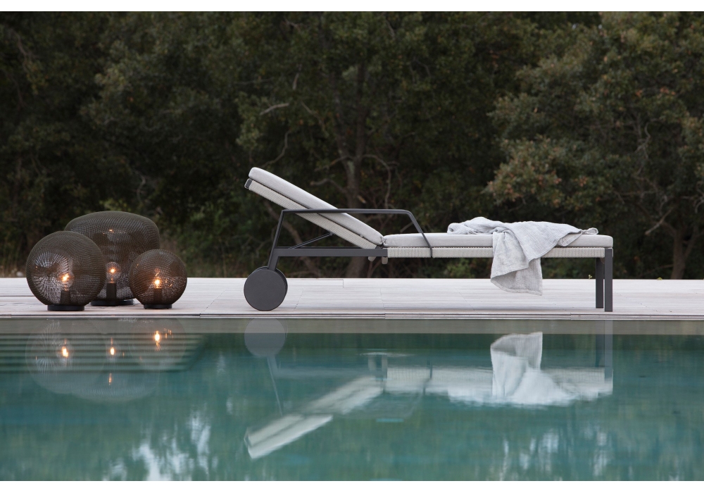 Nodi, von Yabu Pushelberg für Tribù entworfen, ist eine Sonnenliege mit langgliedrigem Gestell aus pulverbeschichtetem Edelstahl, in verschiedenen Ausführungen. Das Weben der Schale ist in Canax, in zwei Farben. Das Sitzkissen ist gepolstert und mit einer Auswahl an Outdoor-Stoffen bezogen.