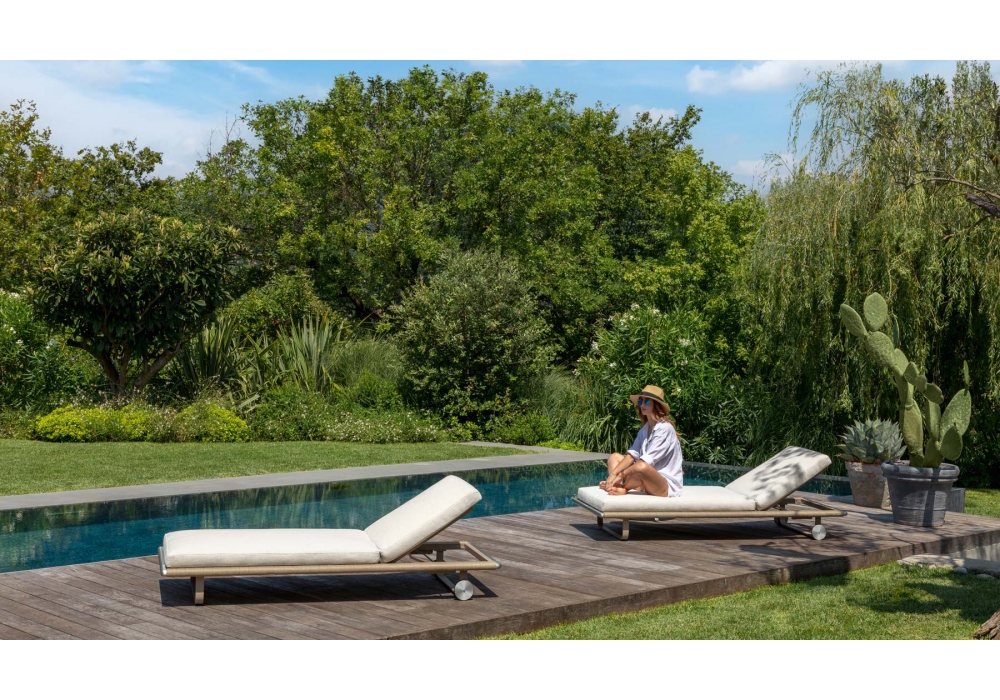 George von Ludovica + Roberto Palomba für Talenti entworfen, ist eine Sonnenliege aus Edelstahlpfosten und verflochtenen gepolsterten Riemen. Kissen mit abnehmbaren Bezügen, Polsterung aus Schnellschaum und Polsterung aus wetterfesten Outdoor-Stoffen.